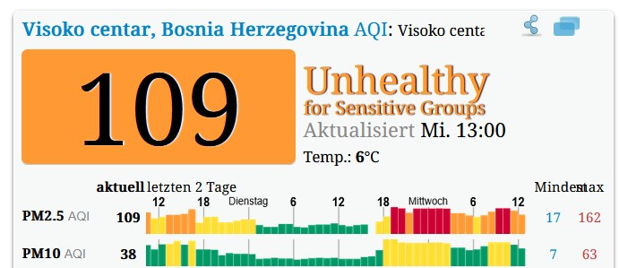 Das sind die aktuellen WHO Grenzwerte, die bei der o.g. Messung in Visoko deutlich überschritten wurden: PM2.5: 20 μg/m³ / PM10: 50 μg/m³